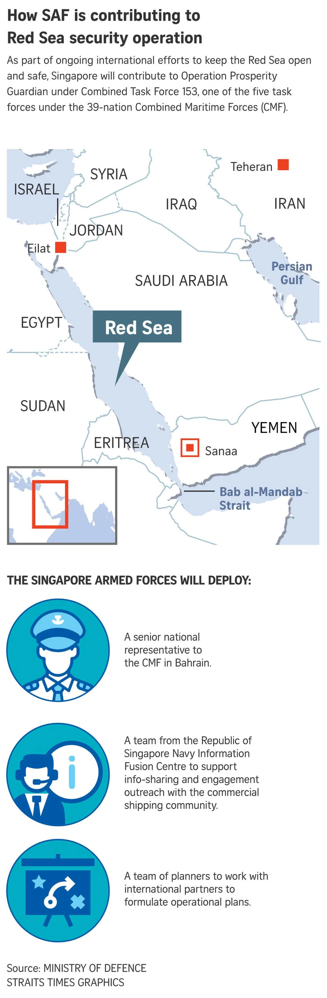 Minister for Defence Ng Eng Hen told Parliament on Jan 9 that SAF’s deployment will involve sending a team from the Republic of Singapore Navy’s Information Fusion Centre to support information sharing, and a team of planners to work with international partners on operational plans.