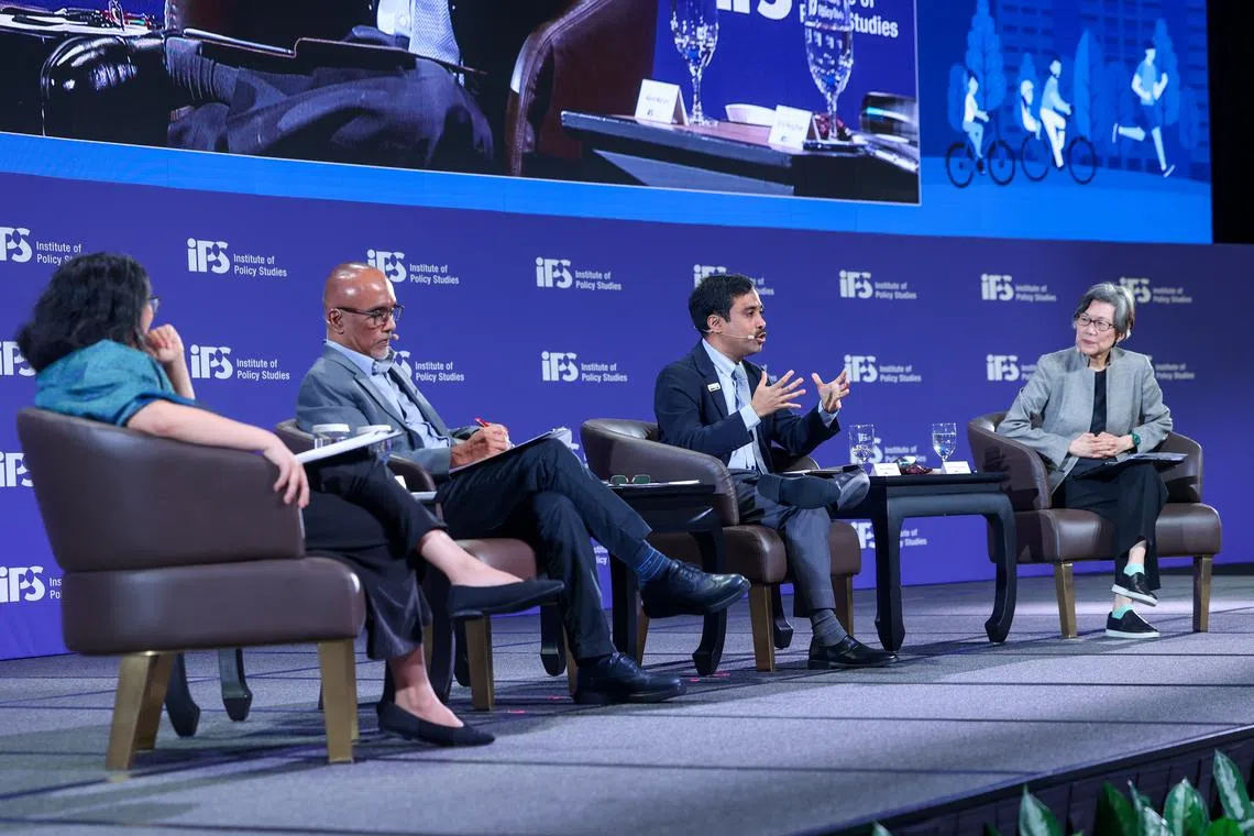 (From left) Economist Joanne Yoong, Hong Kong Baptist University’s Professor Cherian George, Oxford University’s Dr Aaron Maniam, and Ambassador Chan Heng Chee speaking in a panel discussion at IPS’ annual flagship Singapore Perspectives conference on Jan 20.