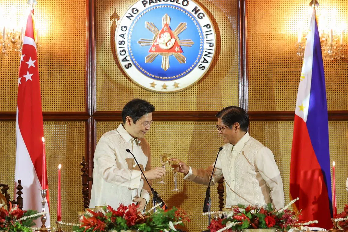 PM Lawrence Wong sharing a toast with Philippine President Ferdinand Marcos Jr during the official dinner in Manila on May 4.