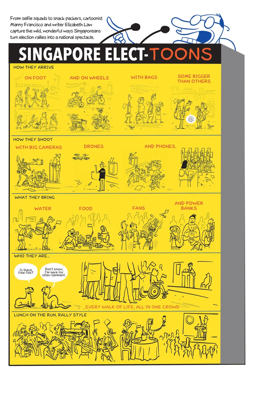 From selfie squads to snack packers, cartoonist Manny Francisco and writer Elizabeth Law capture the wild, wonderful ways Singaporeans turn elections into a national spectacle.