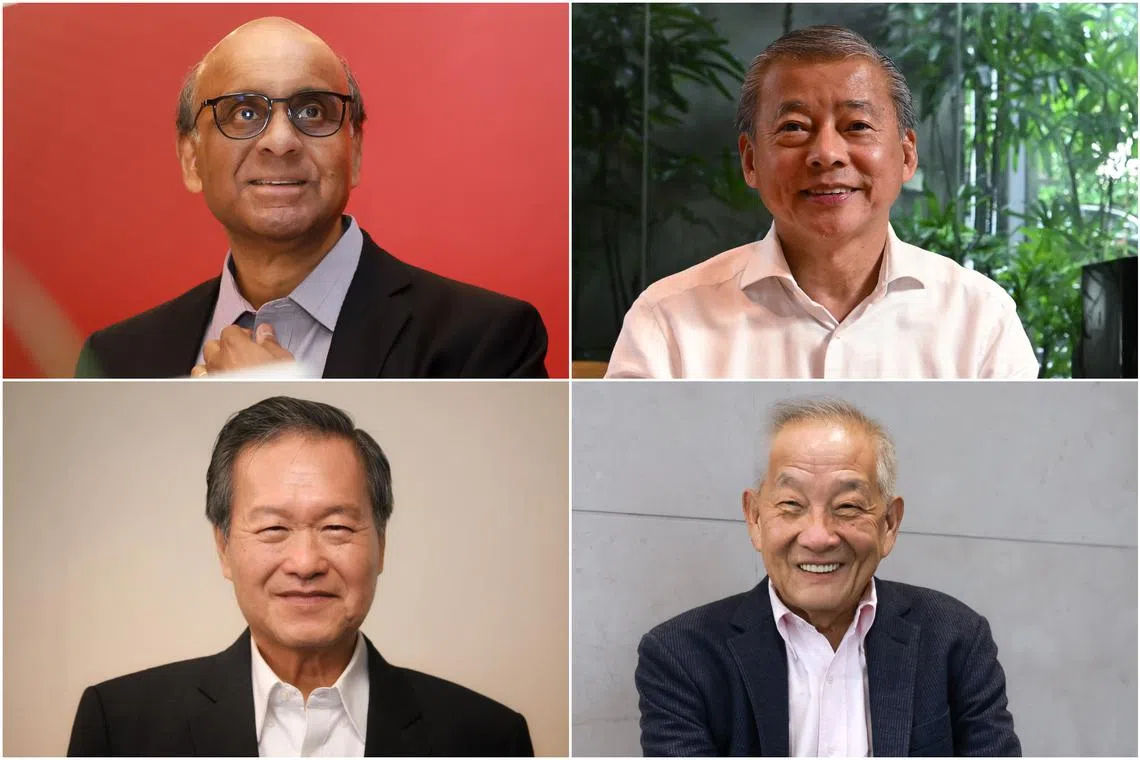 Presidential hopefuls (clockwise from top left) include former senior minister Tharman Shanmugaratnam, entrepreneur George Goh, former GIC investment chief Ng Kok Song and former NTUC Income chief Tan Kin Lian.