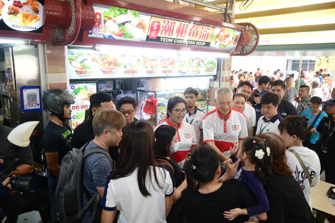 SM Lee Hsien Loong and Seletar-Cheng San MP Nadia Ahmad Samdin greeting residents at Cheng San Market and Cooked Food Centre on April 12.