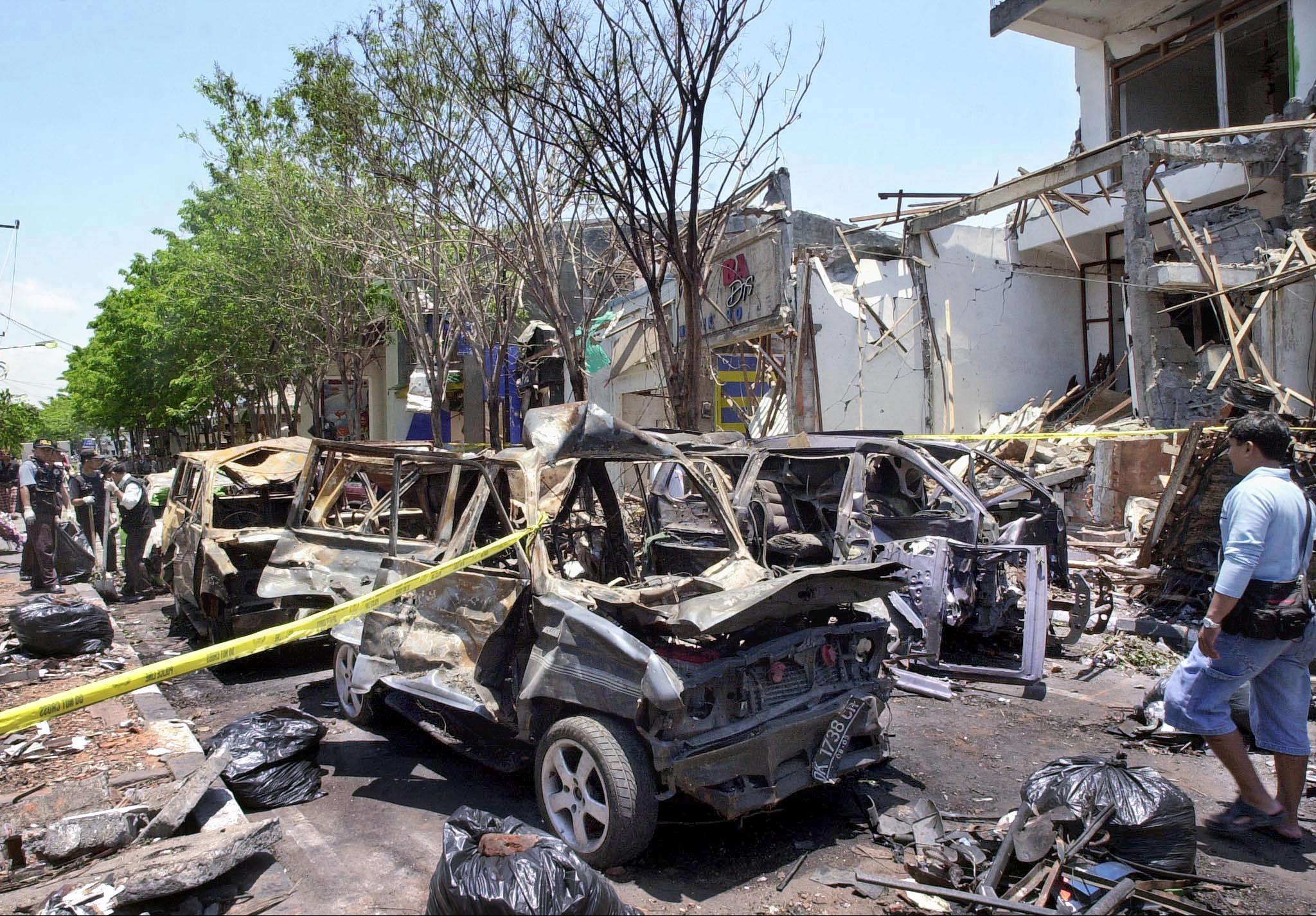 A man walks down a street filled with destroyed vehicles at the car-bombing site in Kuta, Bali, in October 2002.