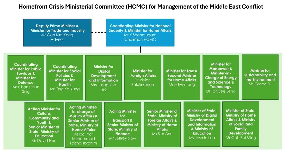 The HCMC, convened by Prime Minister Lawrence Wong to coordinate Singapore’s national response to the crisis, is the political leadership charged with setting the direction and providing strategic guidance for the overall government response to major crises.