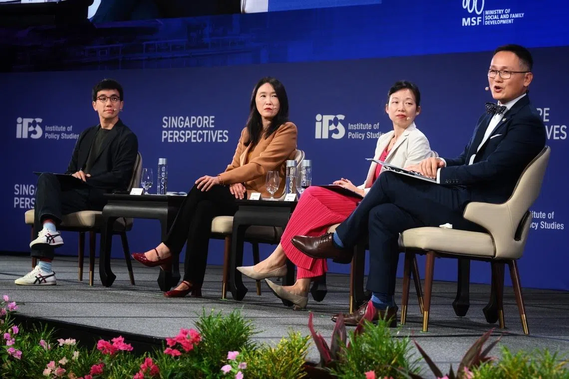 (From left) Stranger Conversations founder Ang Jin Shaun, Singapore Management University Professor Lim Sun Sun and Minister of State for Digital Development and Information Jasmin Lau during a panel discussion moderated by Dr Chew Han Ei, a senior research fellow at IPS, on Jan 26.