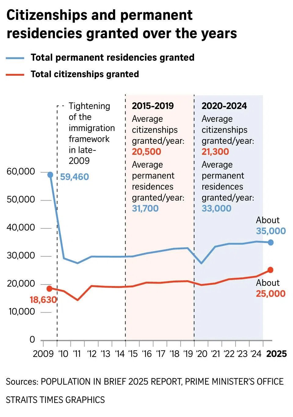 About 25,000 individuals became Singapore citizens in 2025. An average of 21,300 citizenships were granted yearly between 2020 and 2024, according to the Population In Brief 2025 report.