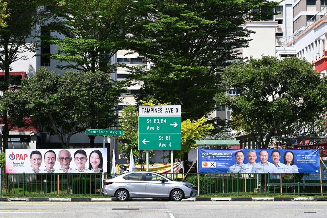 Banners of PAP and WP Tampines GRC candidates displayed in Tampines Avenue 3 on April 30.