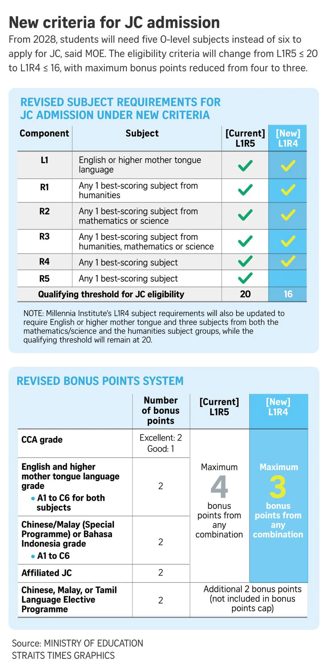 Students applying to JC from 2028 to use L1R4 score, requiring five O-level subjects instead of six