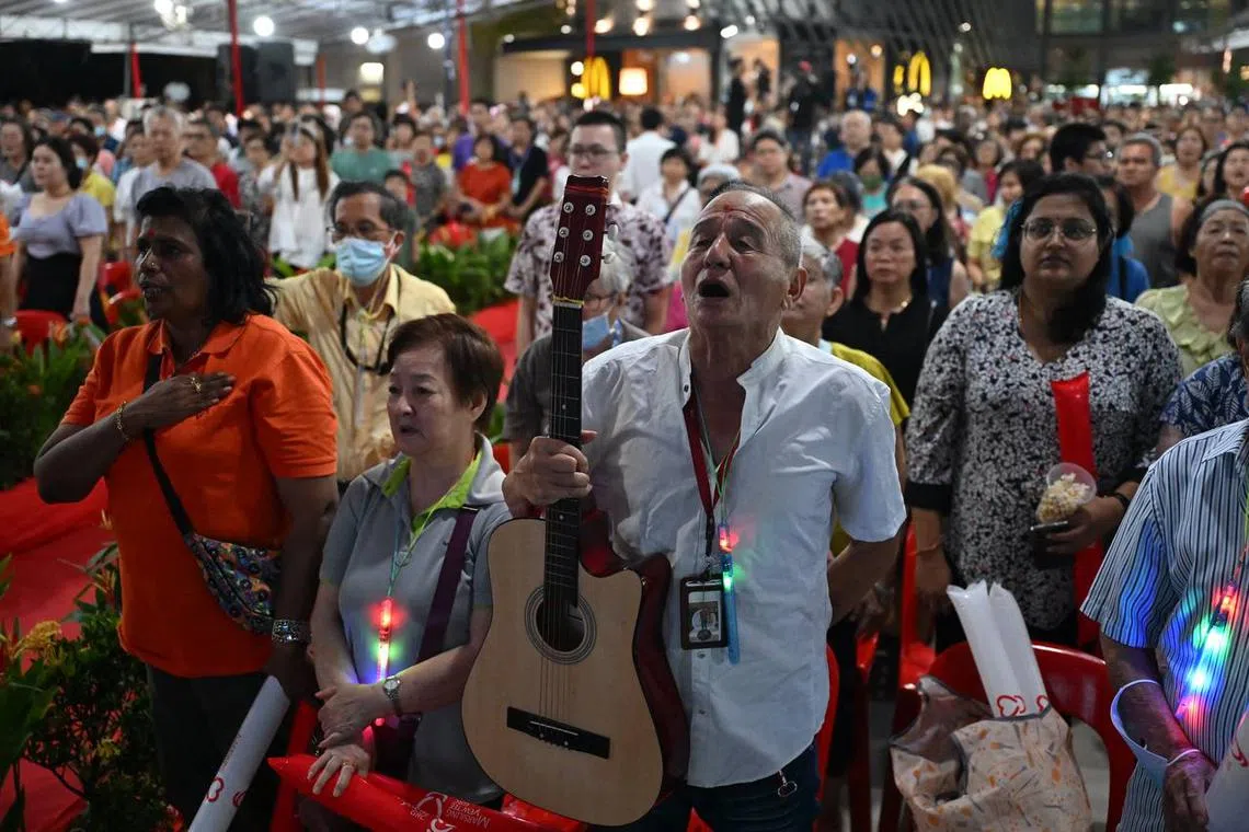 Residents singing the National Anthem at the May Day Sing-along event held next to Yew Tee MRT station on May 15.