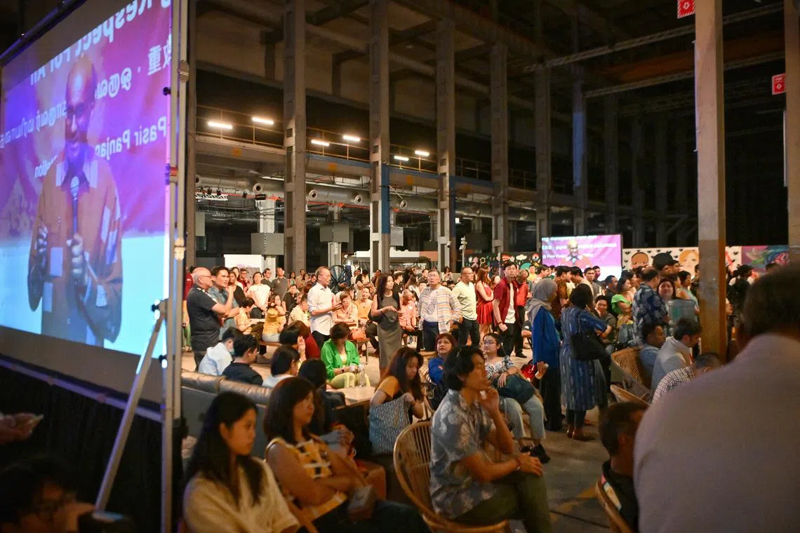 Guests at Mr Tharman Shanmugaratnam’s election meeting at Pasir Panjang Power Station on Friday.