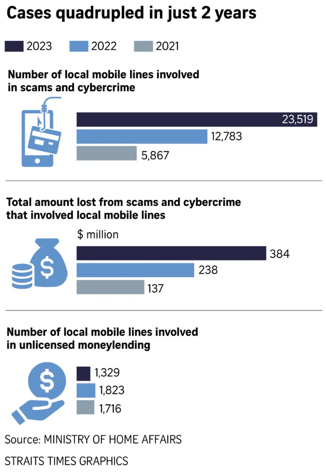 The number of local mobile lines involved in scams and other cybercrimes jumped from 5,867 in 2021 to 23,519 in 2023. The amount lost in such cases almost tripled, from $137 million in 2021 to $384 million in 2023.