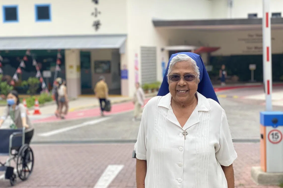 Sister Gerard Fernandez trudges out of the Good Shepherd Place in Toa Payoh, her right hand holding a walking stick. Another nun, Sister Fiona, holds on to her left arm.