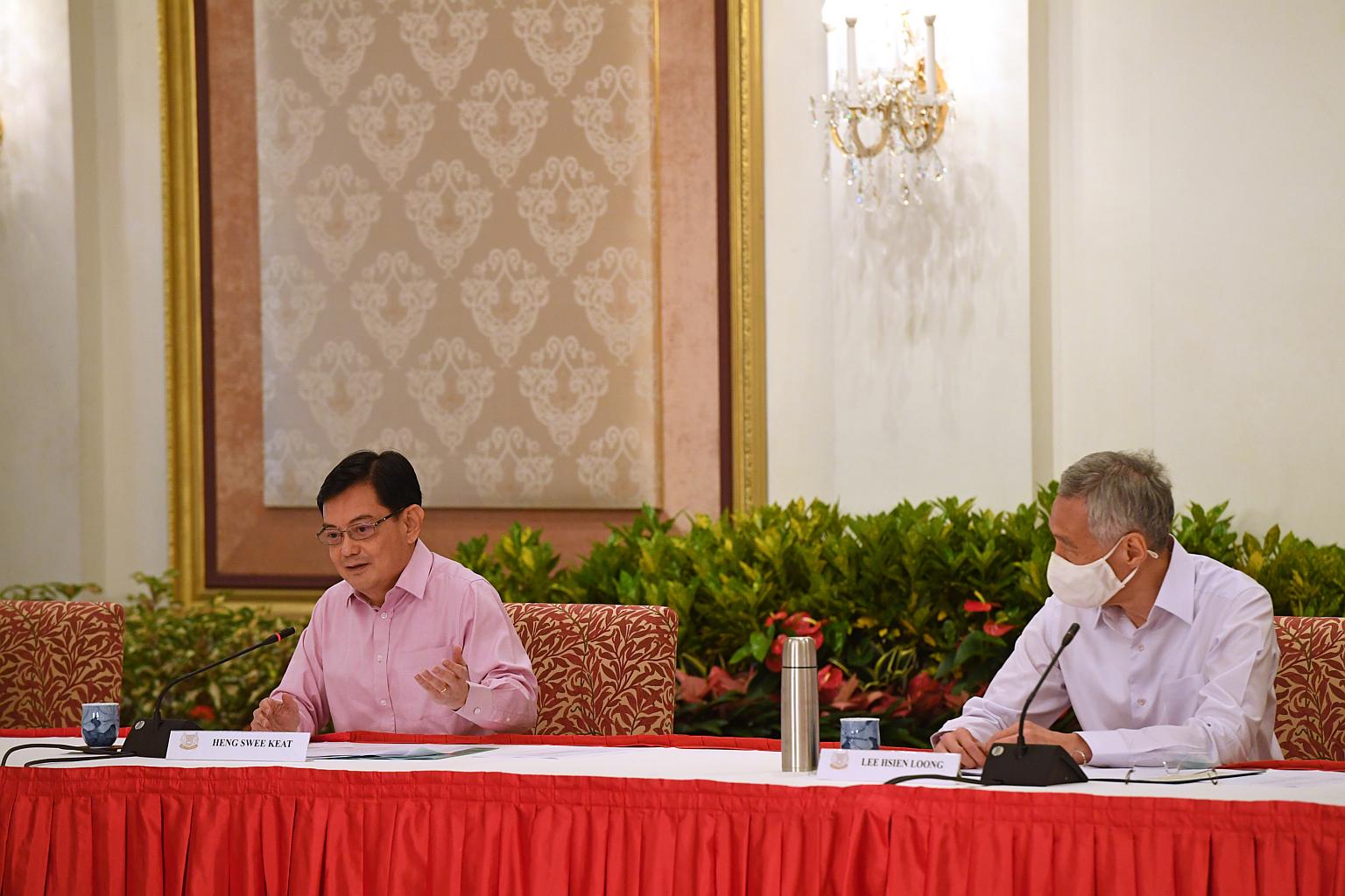 DPM Heng Swee Keat (left) speaking at a press conference with PM Lee Hsien Loong at the Istana on April 8, 2021.
