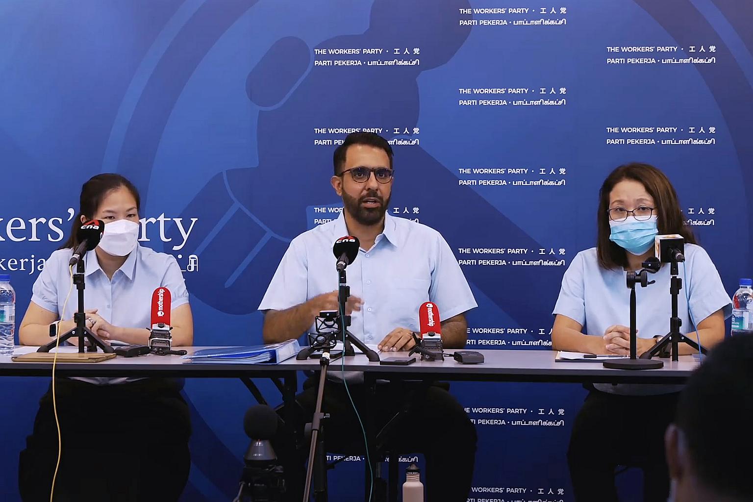 Workers' Party chief Pritam Singh with party chairman Sylvia Lim (right) and Sengkang GRC MP He Ting Ru speaking to the media on Dec 2, 2021.