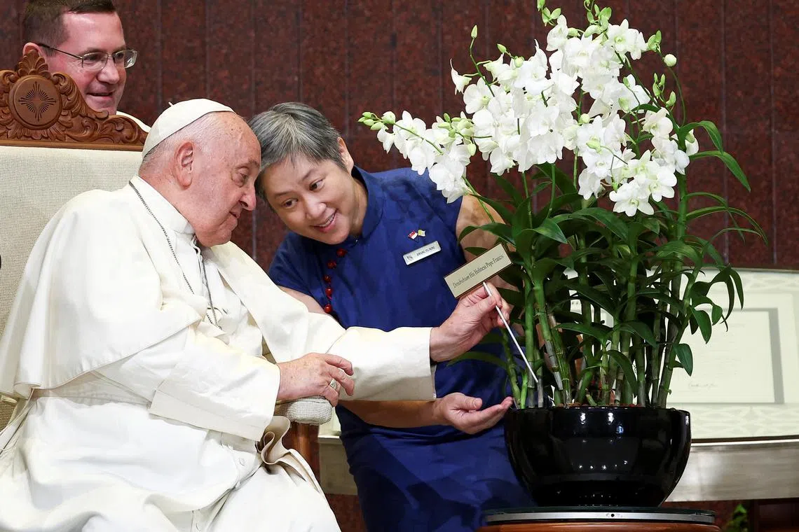 National Parks Board CEO Hwang Yu-Ning presents Pope Francis with white orchids named “Dendrobium His Holiness Pope Francis” during the welcome ceremony on Sept 12.