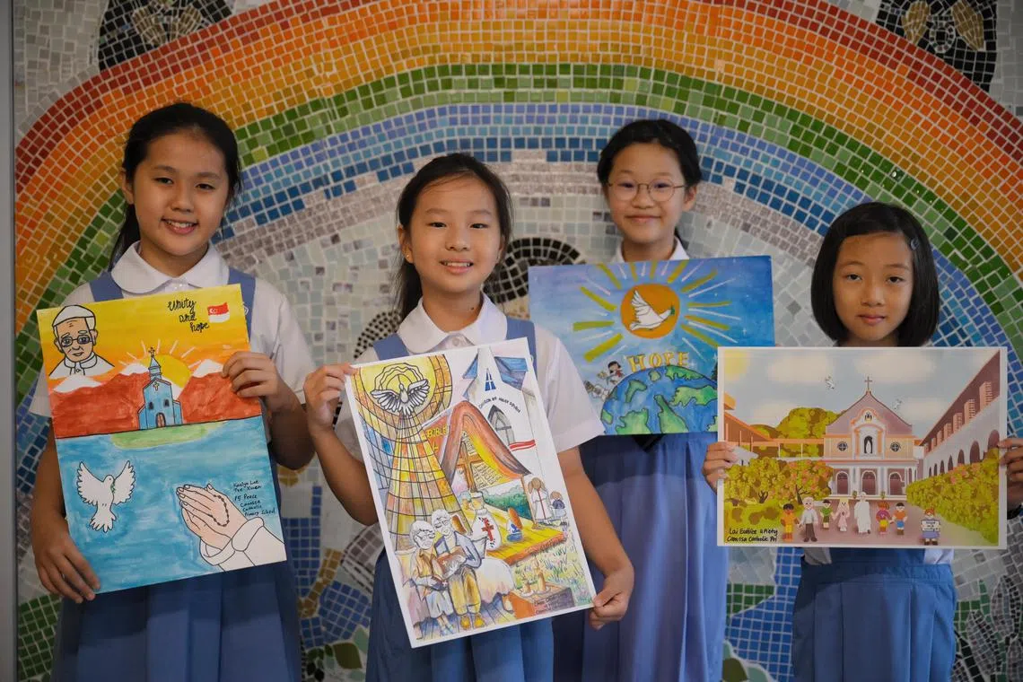 (From left) Canossa Catholic Primary School students Kaelyn Lee, 11; Chao Chia-Ling, 10; Karis Chan, 11; and Eunice Lai, 10, with artwork they did before Pope Francis’ visit to Singapore.