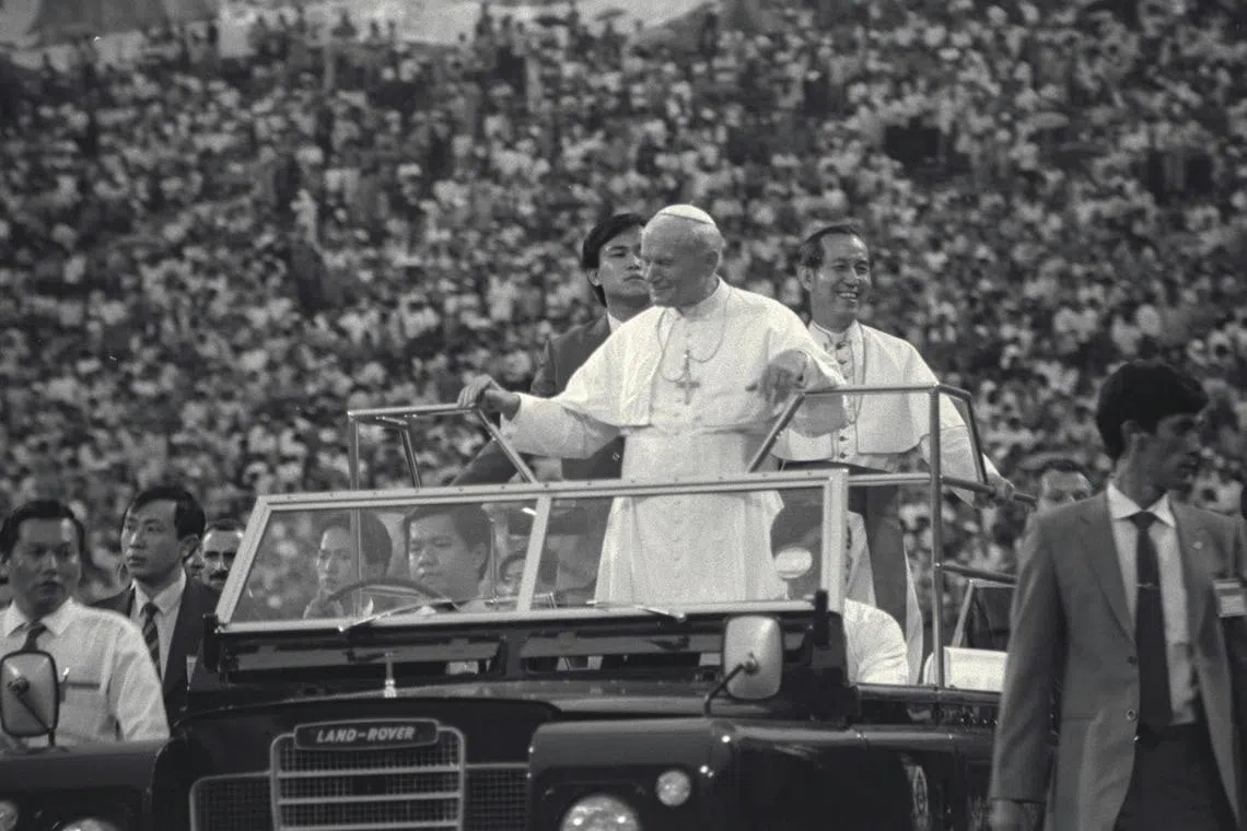 The late Pope John Paul II arriving at the National Stadium in an open-topped Land Rover for the papal Mass in 1986. He delivered his homily, a message of love and peace that lasted nearly half an hour.