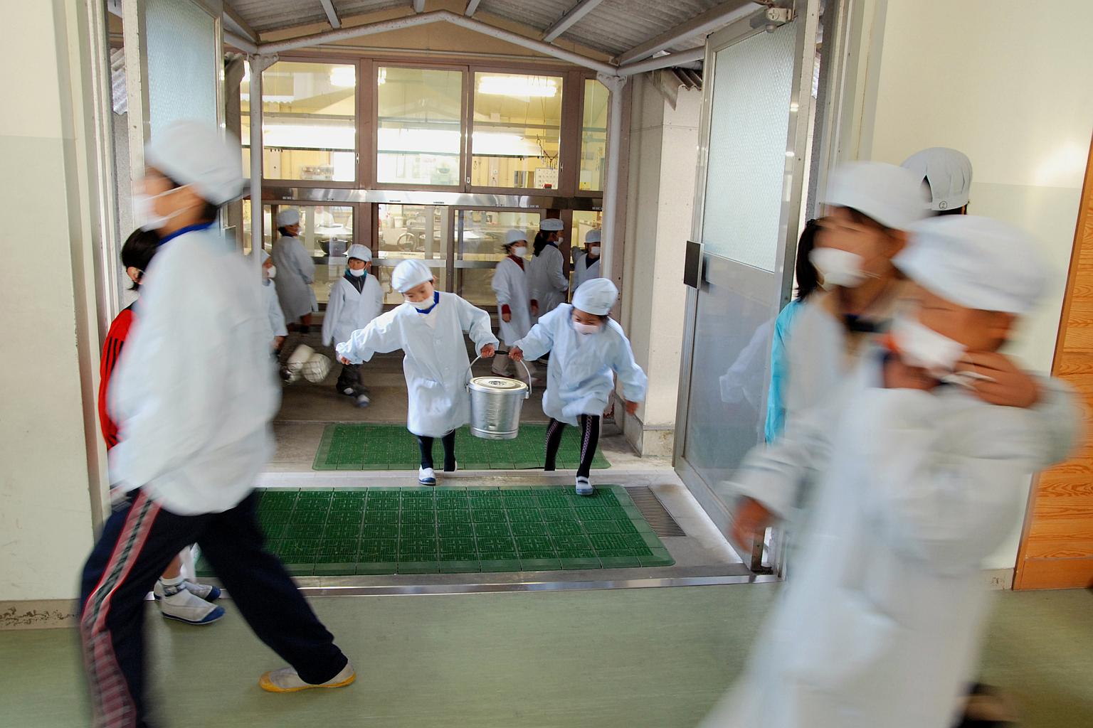 Young Japanese pupils are rostered to carry their meals from the school kitchen to their classrooms and clean the school compound.