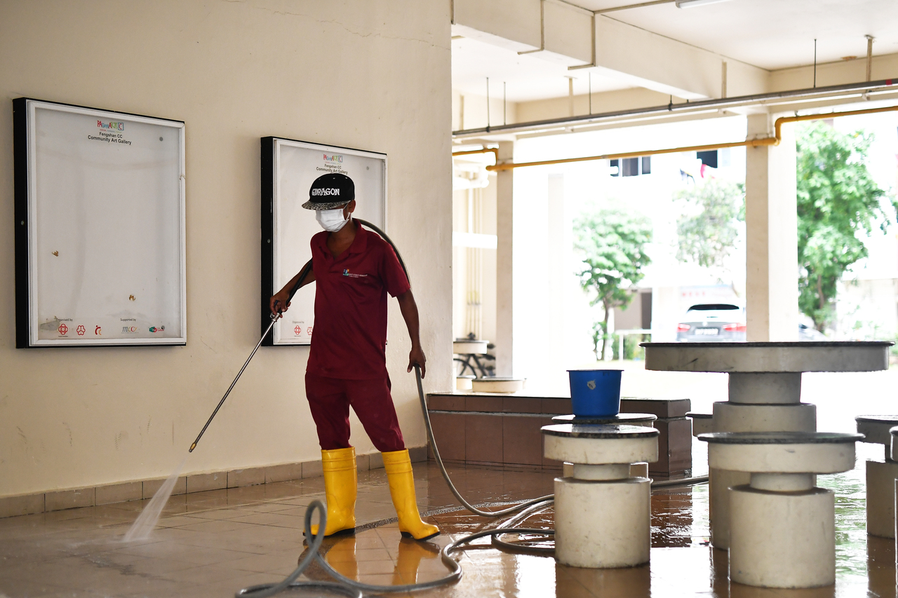 A town council worker cleans the floor with a high-pressure jet at a HDB block in Fengshan on March 24, 2020.