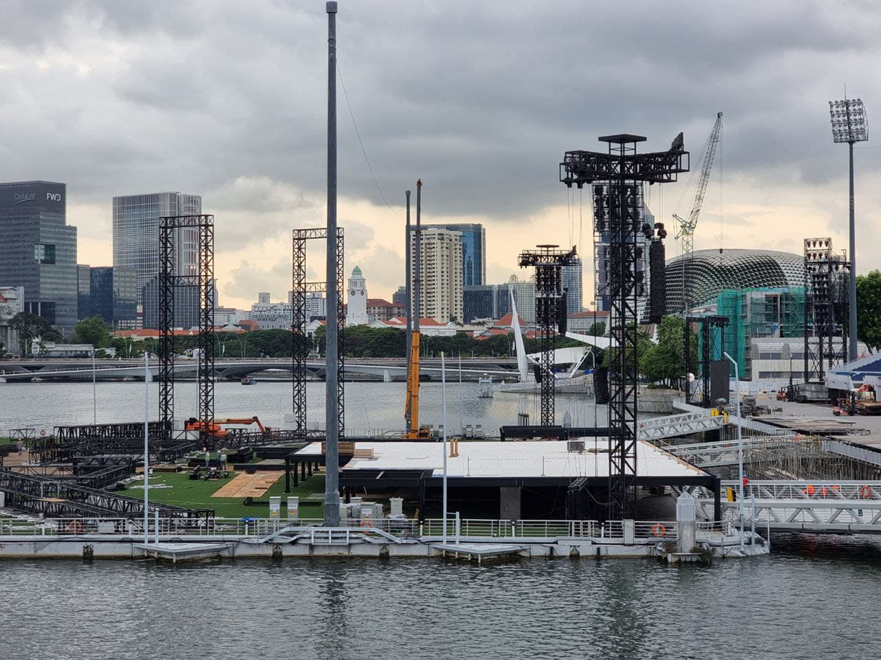 Installation work, on what appears to be a stage, being done on the floating platform at Marina Bay on May 27, 2021.