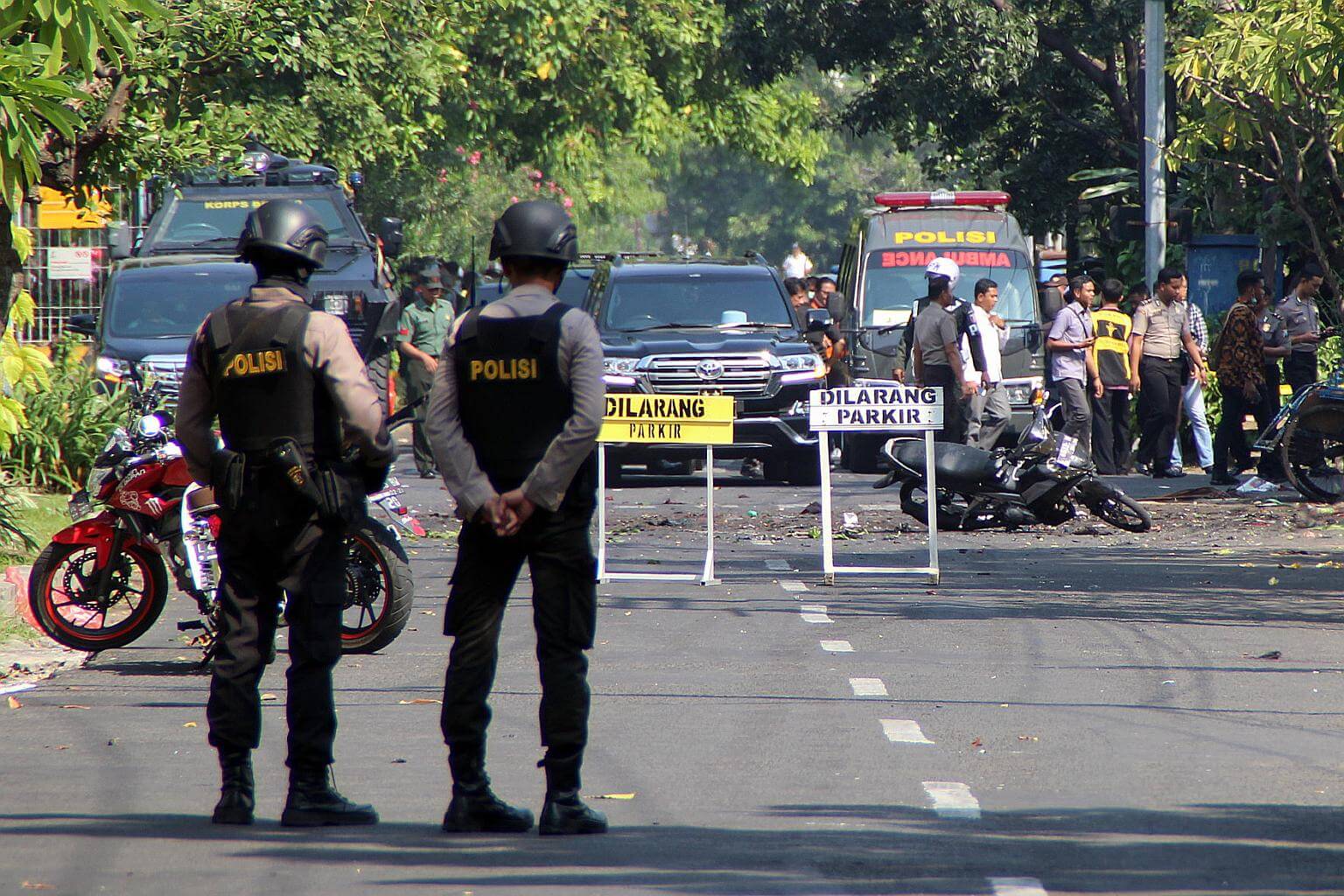 Indonesian bomb squad officers inspecting the blast site in front of the church in Surabaya, East Java, Indonesia, on May 13, 2018.