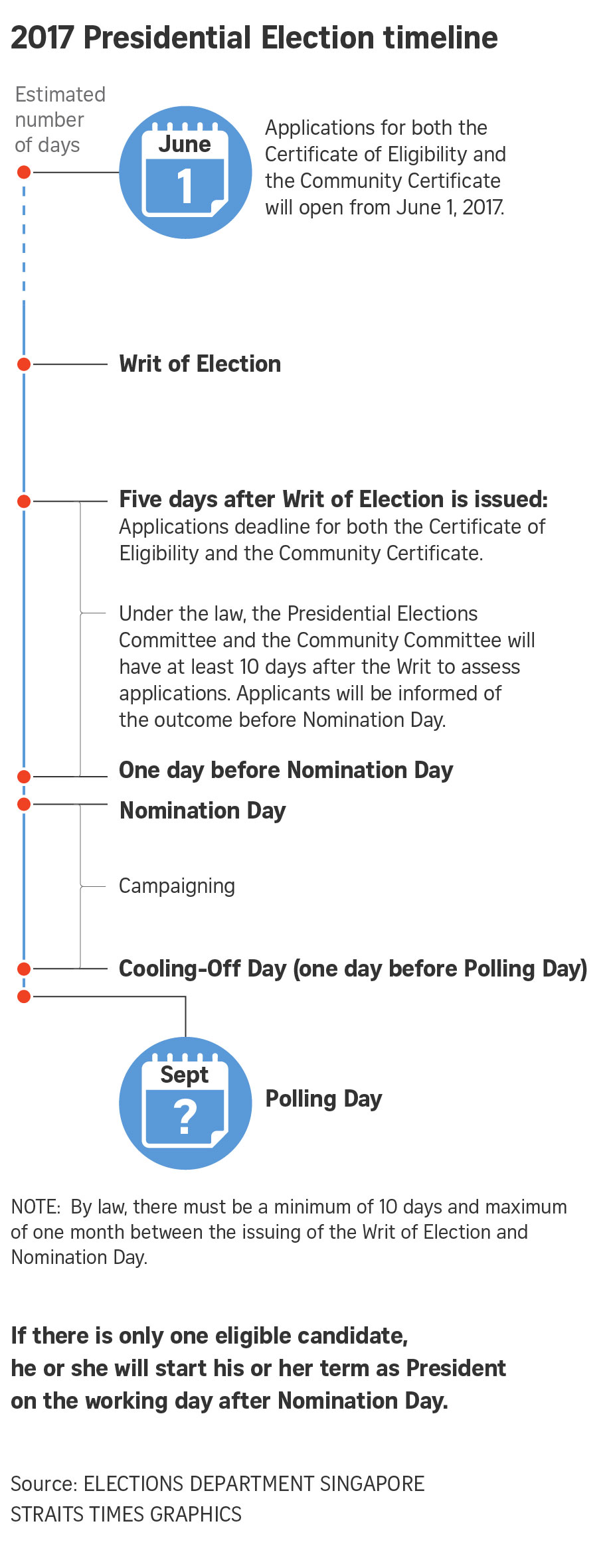 In the 2011 presidential election, the writ was issued on Aug 3. Campaigning began after National Day (Aug 9) but was held during the month-long National Day celebrations period, said Mr Chan. Voters went to the polls on Aug 27.