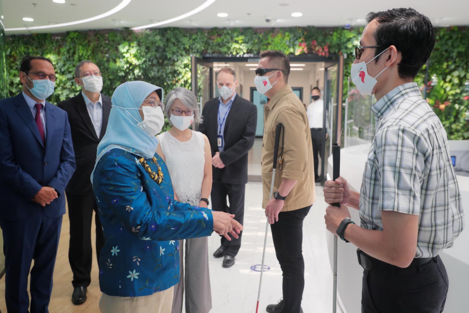 President Halimah Yacob greeting visually impaired sensory panellists Muhammad Zahier (right) and Bernard Chew at Firmenich’s Global Perfumery Creative Centre on Aug 19, 2020.