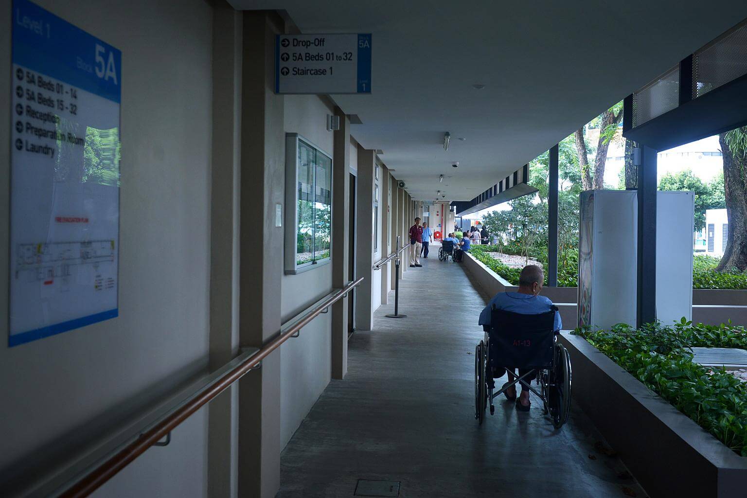 An elderly person on a wheelchair at the Pearl's Hill Care Home located on Pearl's Hill Road.