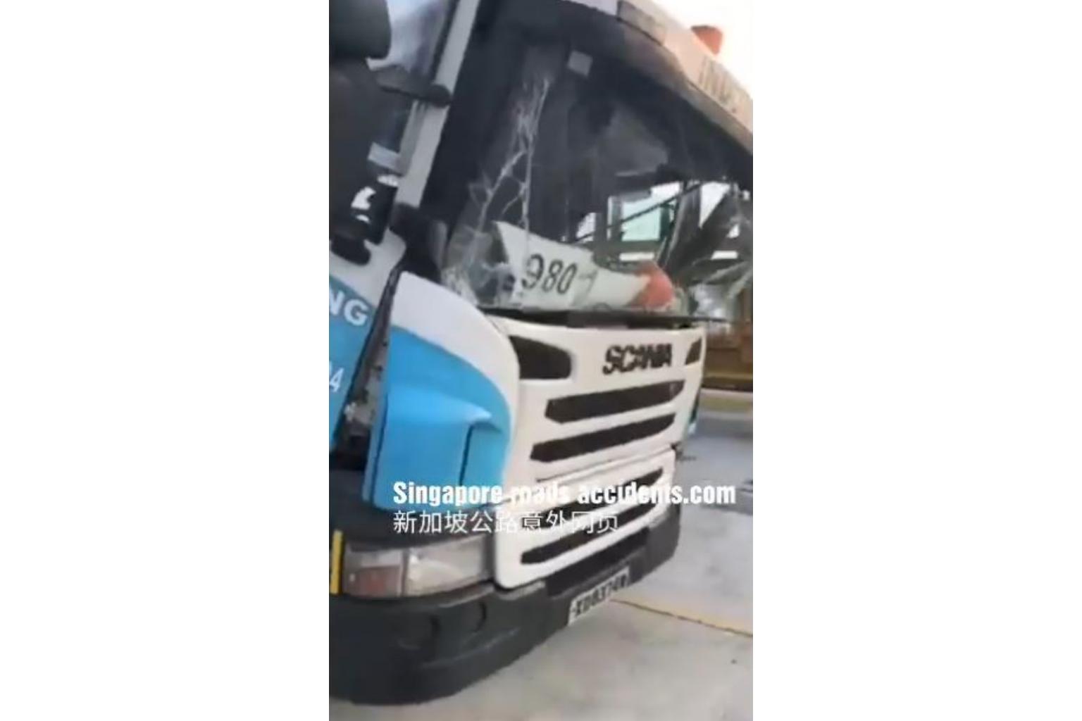 In a video posted on Facebook group Singapore Roads Accident.com, a prime mover is seen with its cabin crushed and windscreen shattered.