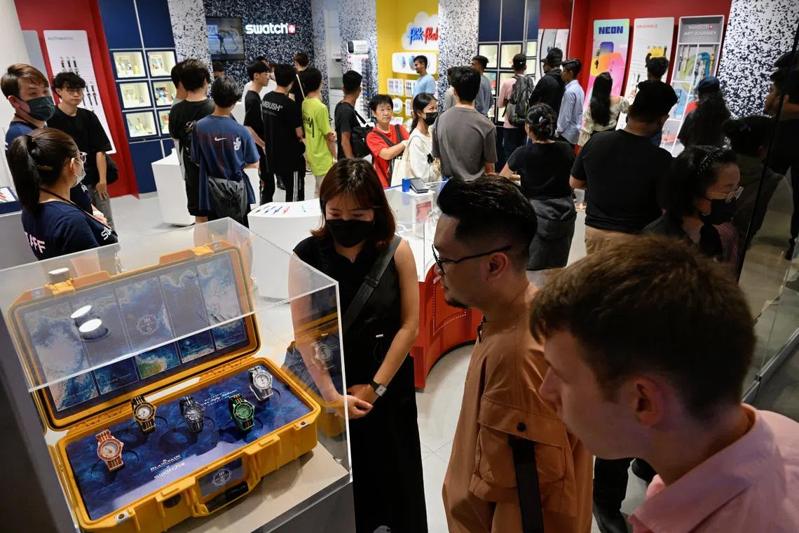 SINGAPORE – An orderly queue of more than 200 eager shoppers waited patiently outside each of the two Swatch boutiques launching the Swiss watch brand’s highly anticipated new Bioceramic Scuba Fifty Fathoms collection