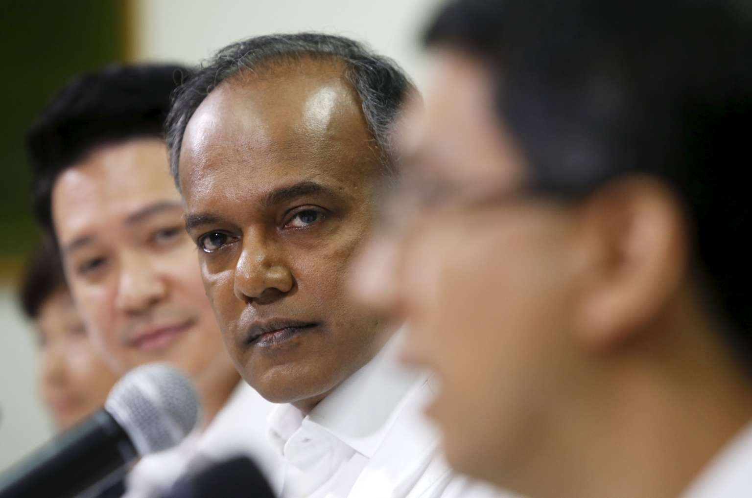 Singapore's Law and Foreign Minister K Shanmugam (second right) attends a People's Action Party news conference to unveil new candidates ahead of General Election 2015 on Aug 26, 2015.