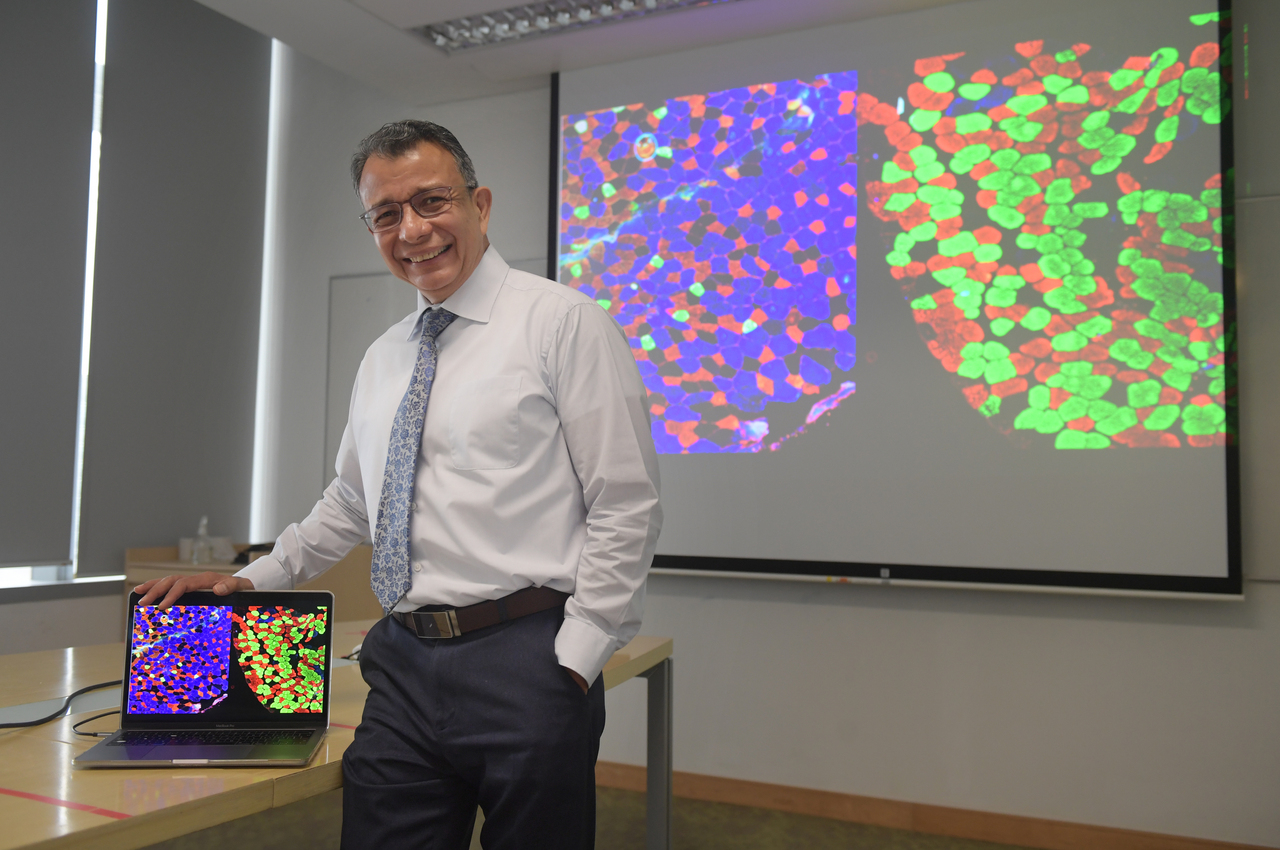 Associate Professor Alfredo Franco-Obregon of NUS' Institute for Health Innovation and Technology showing an image with the different muscle fibre types.