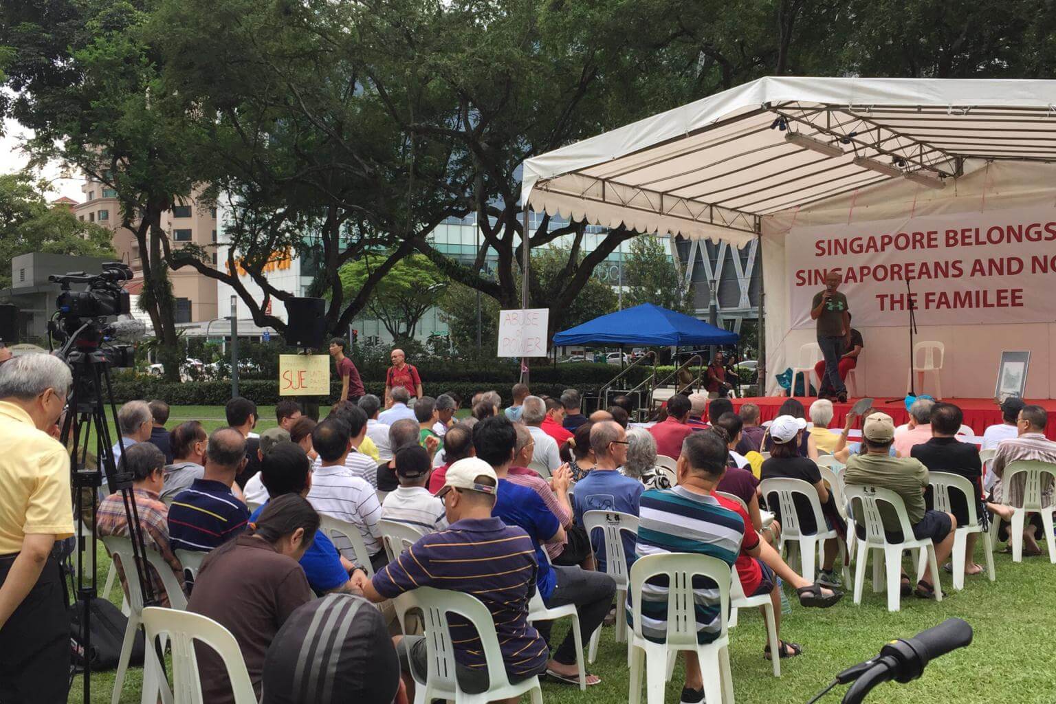 On Saturday, Mr Goh and eight other speakers used a small stage with a backdrop reading "Singapore belongs to Singaporeans and not to the FamiLee".