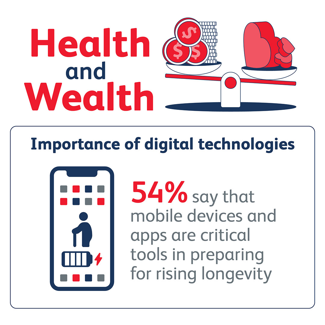 One of the report’s key findings is that more than half (54 per cent) of the respondents describe mobile devices and apps as critical tools in preparing for rising longevity.