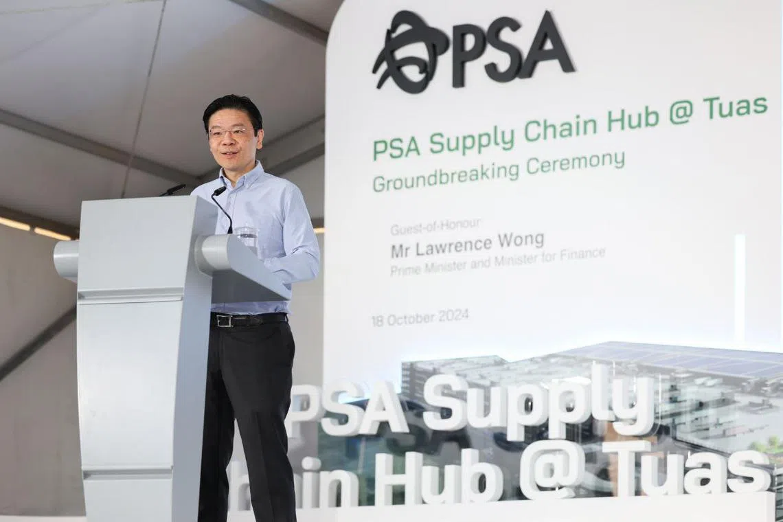 PM Lawrence Wong addressing the audience during the launch of the PSA Supply Chain Hub @ Tuas ground-breaking ceremony on Oct 18.