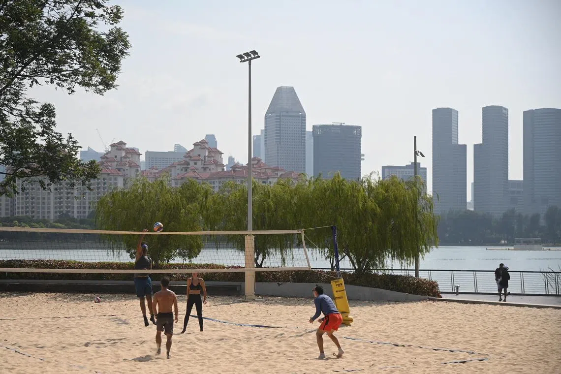 People playing beach volleyball outside the Singapore Sports Hub at around 3.30pm on Oct 8 as the air quality returned to healthy levels.
