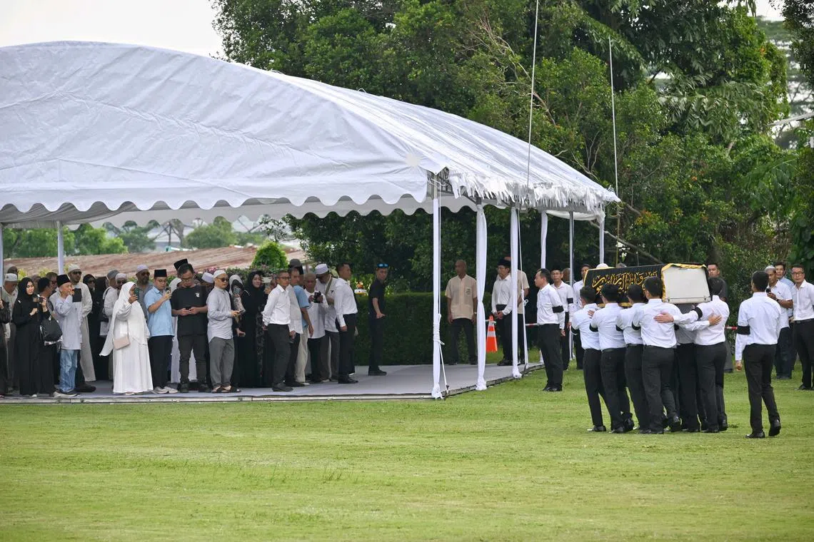 At about 1.35pm, her casket was carried by eight pallbearers, who transferred her to a ceremonial gun carriage in a silent, dignified ceremony. Mosque-goers waved goodbye to the carriage as it made its way to Kranji State Cemetery, where a large white marquee sheltered attendees from the blazing sun for her afternoon burial.