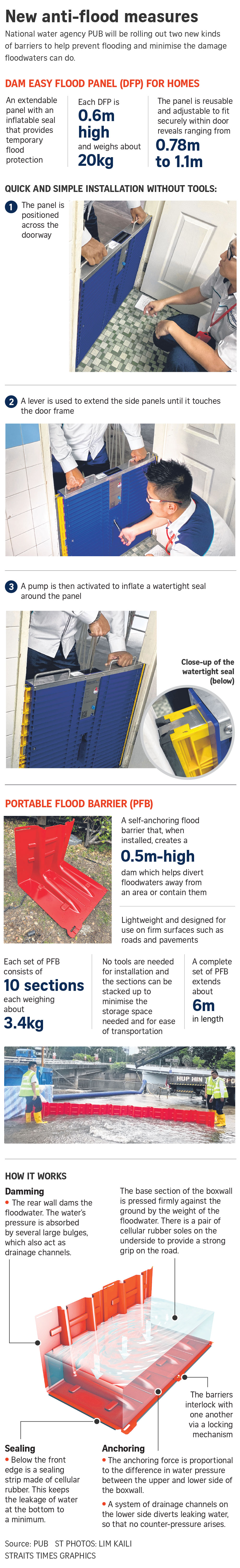 Mr Yeo Keng Soon, PUB's director of catchment and waterways, said the two new kinds of barriers will complement PUB's existing measures and it will continue to find new ways to prevent and curb damage from flood waters.