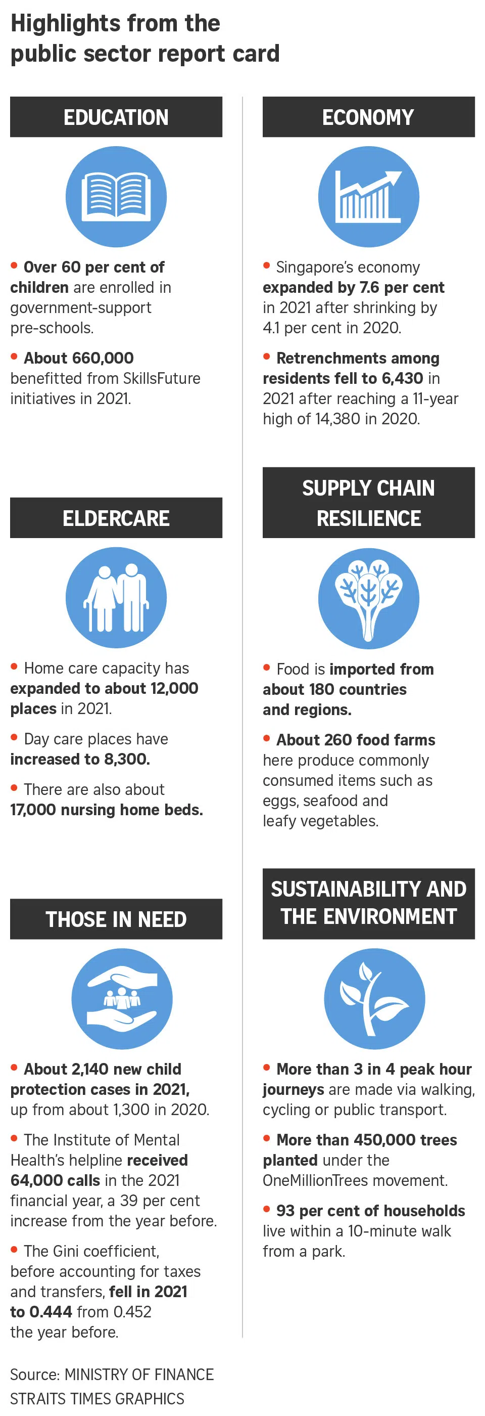 These developments, which reflected the impact of the Covid-19 pandemic on Singapore, have been recorded in the latest edition of the Singapore Public Sector Outcomes Review, the public sector’s report card, which was released on Tuesday by the Ministry of Finance.