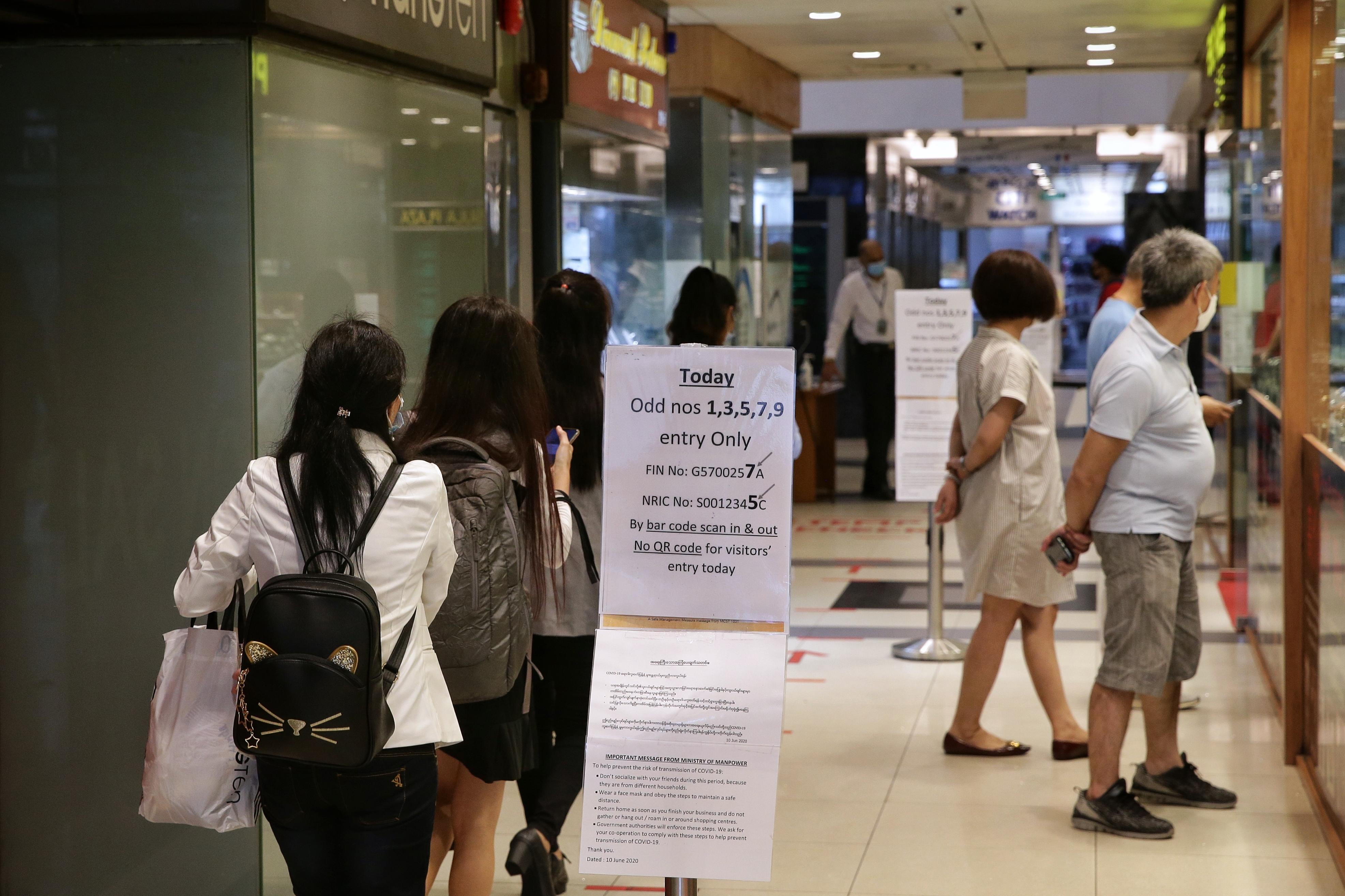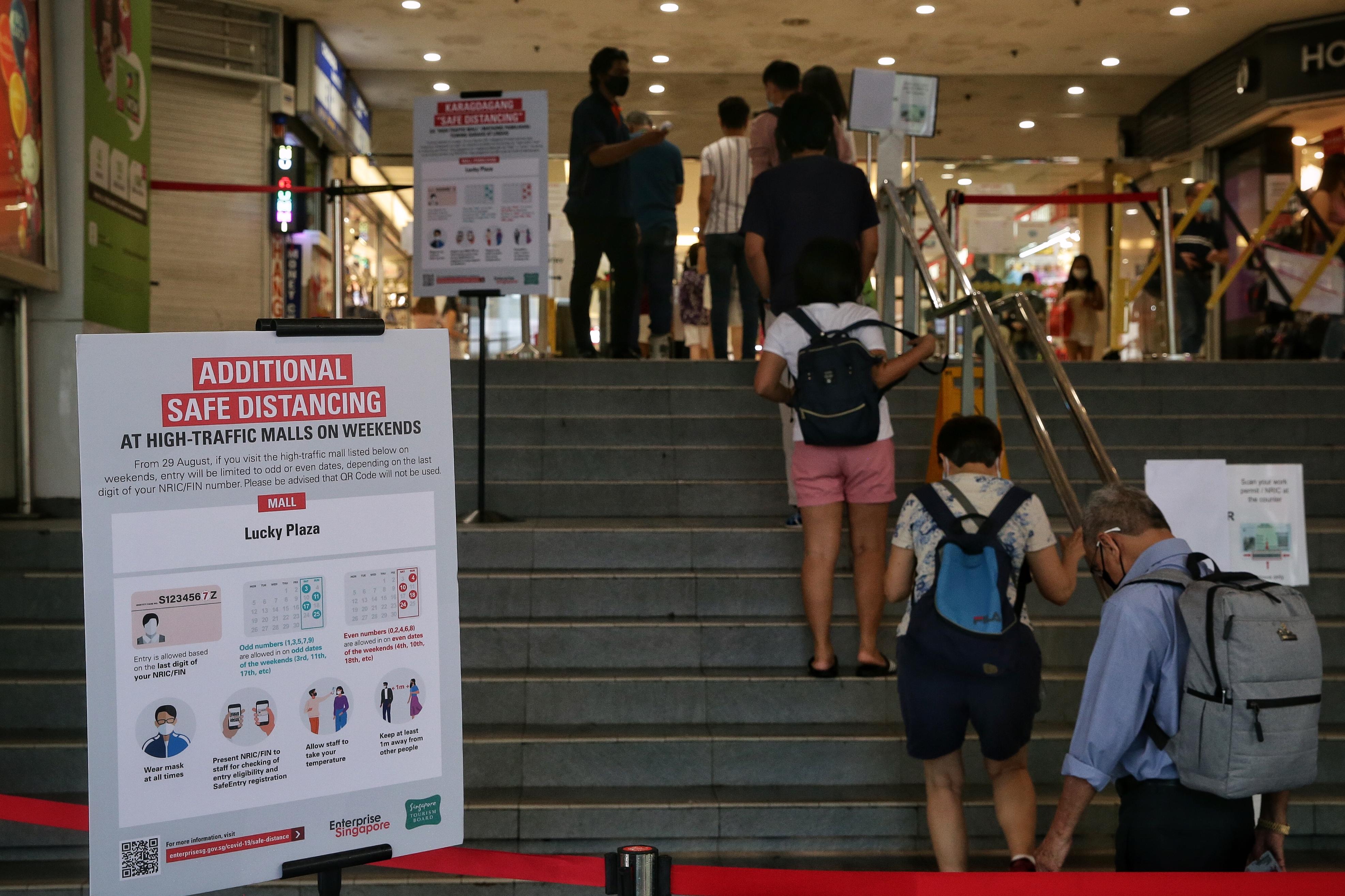 The restrictions - they also apply at Peninsula Plaza in North Bridge Road - allow people with ID cards ending in an odd number to enter odd dates, and those with ID cards ending with even numbers to enter only on even dates.