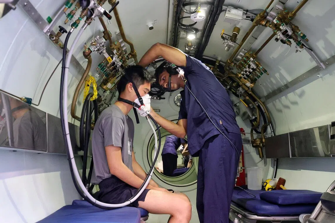 Underwater medic LCP Arjun Manikkath helping a rescued submariner undergo increased oxygenation in the hyperbaric chamber during Exercise Pacific Reach 2025 on Sept 18.