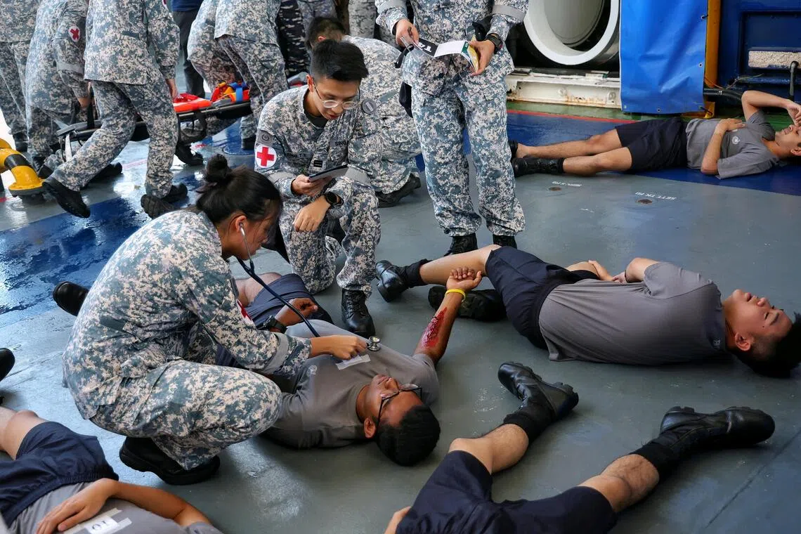 Rescued submariners undergoing medical triage during Exercise Pacific Reach 2025 at Changi Naval Base on Sept 18.