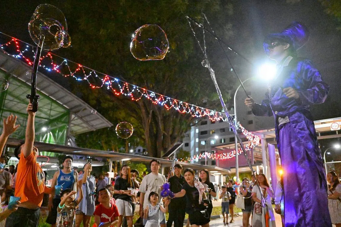 Jugglers, mime artists and stilt walkers lined the street in Sembawang, performing for the crowd.