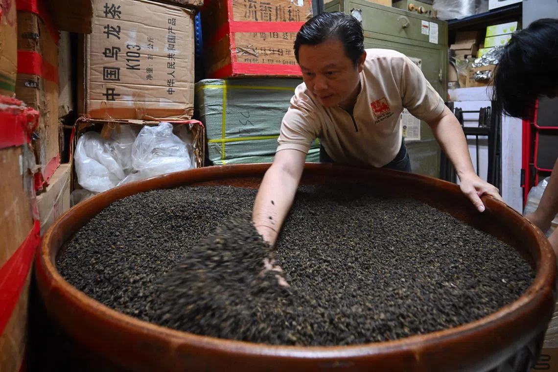 Mr Kenry Peh, a fourth-generation owner of Pek Sin Choon, blending leaves in his tea shop.