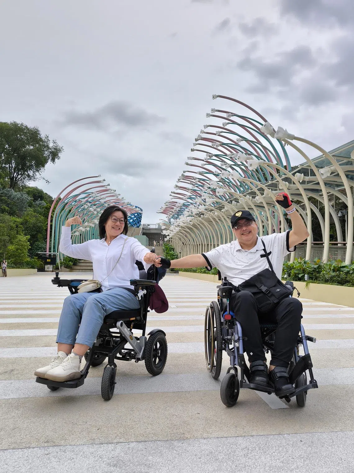 Mr Warren Sheldon Humphries is now a Sentosa Wheel-Venture Accessibility Tour docent, or guide. He is seen here with fellow guide Joanne Toh, 53, at Sentosa’s Glow Garden.