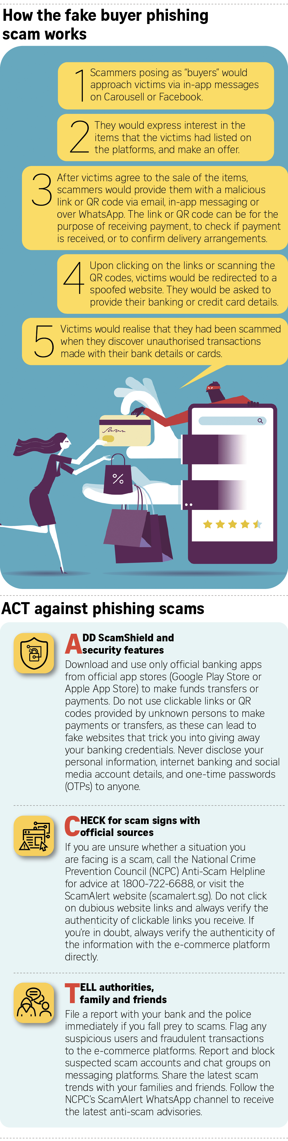 In the first two months of 2024, at least 419 victims have fallen prey to fake buyer phishing scams on Facebook and Carousell, says the Singapore Police Force (SPF). Total losses: More than $1.8 million.