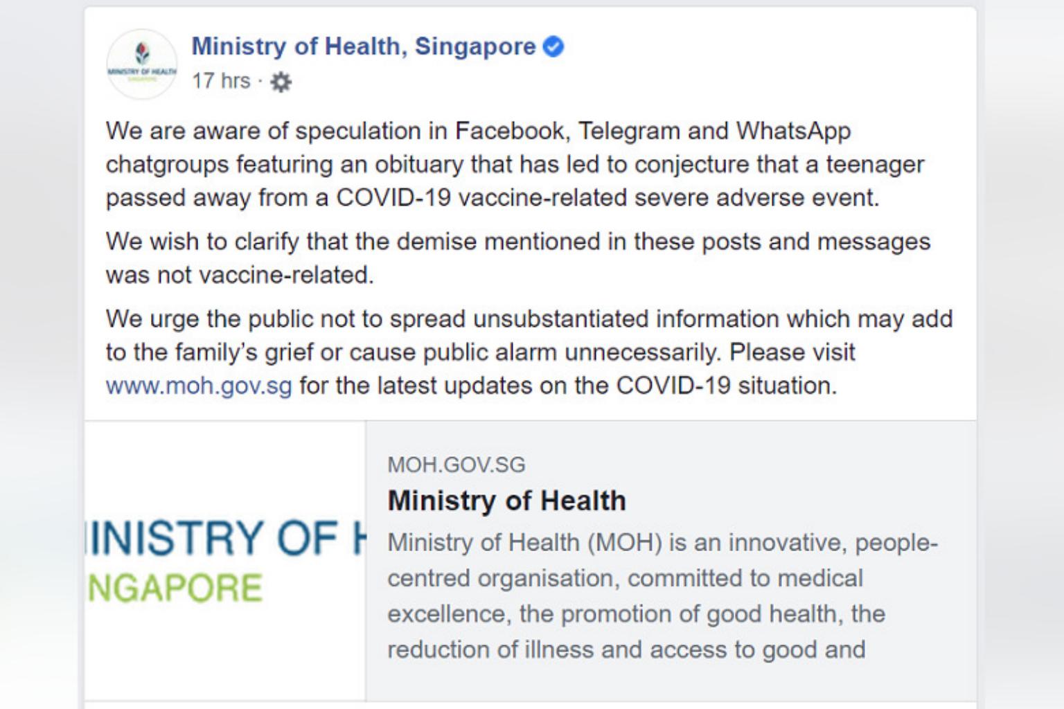 SINGAPORE - The recent death of a 16-year-old boy is not linked to vaccination, the Ministry of Health (MOH) clarified in a Facebook post on Wednesday (July 14).