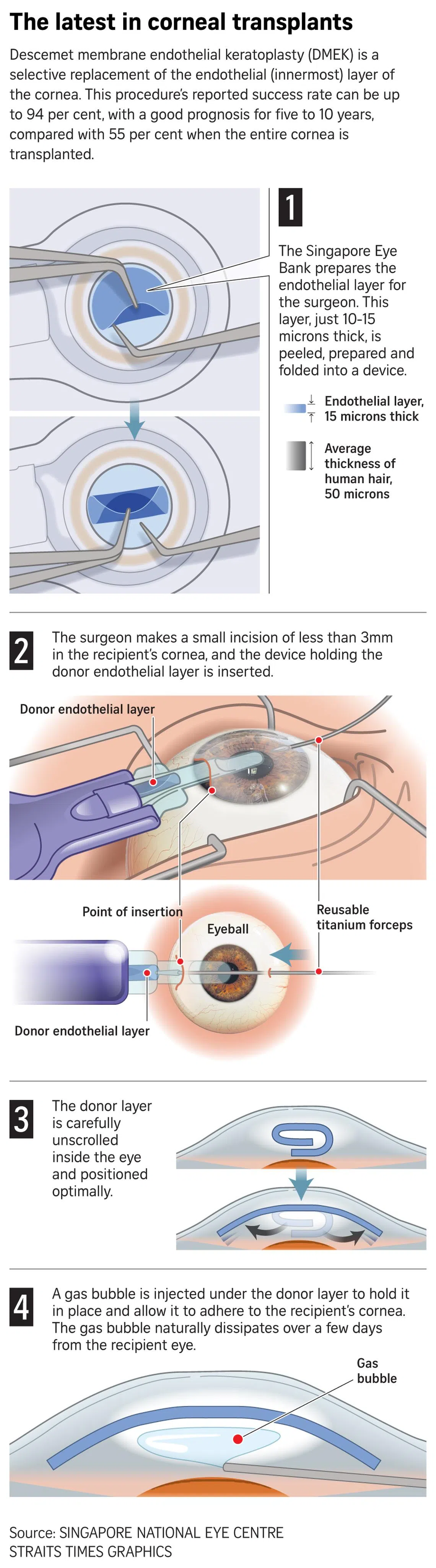 The method most commonly used now, called Descemet membrane endothelial keratoplasty (DMEK), has a success rate of 94 per cent. Prof Ang said this method uses just one of the five layers that make up the cornea.