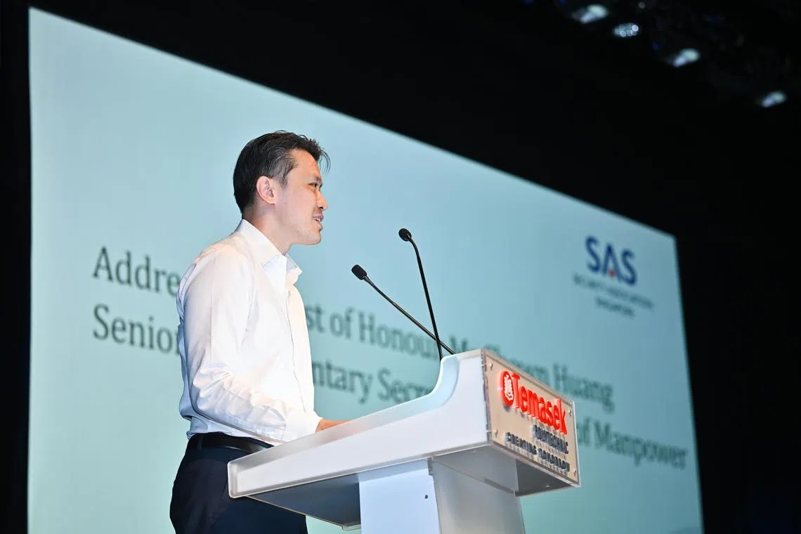 Senior Parliamentary Secretary for Manpower Shawn Huang speaking at the Security Officers Day Awards 2025 at Temasek Polytechnic on July 24.