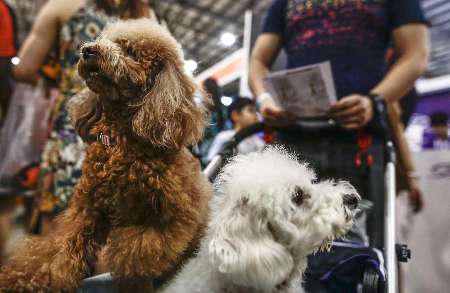 Two poodles pictured in a pram at the Pet Expo 2016 on March 25, 2016.